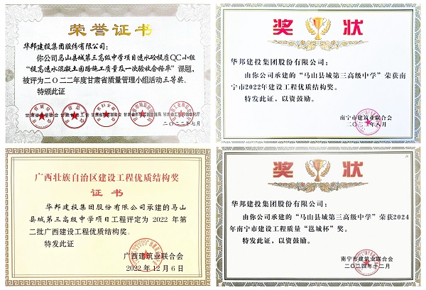 在项目建设过程中,开云官方网页版始终坚持“安全第一、质量为本”的理念,大力推行安全文明施工和精细化管理,积极应用新技术、新工艺、新设备,全面提升工程质量和安全水平。马山中学项目还荣获“2022年度甘肃省质量管理小组活动三等奖”“2022年第二批广西建设工程优质结构奖”“南宁市2022年建设工程优质结构奖”“2024年南宁市建设工程质量‘邕城杯'奖”等多项荣誉。